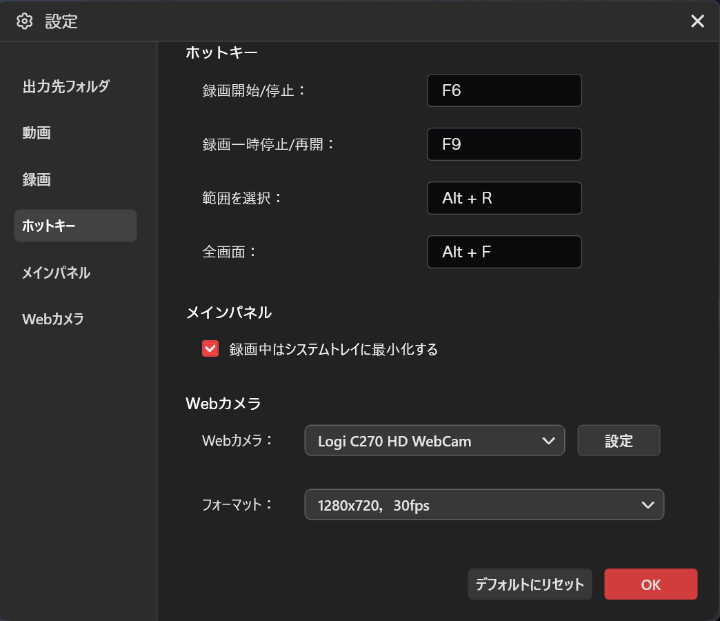 Webカメラ項目で使用する機器を選択、フォーマットで撮影のサイズやFPSを選択出来ます。